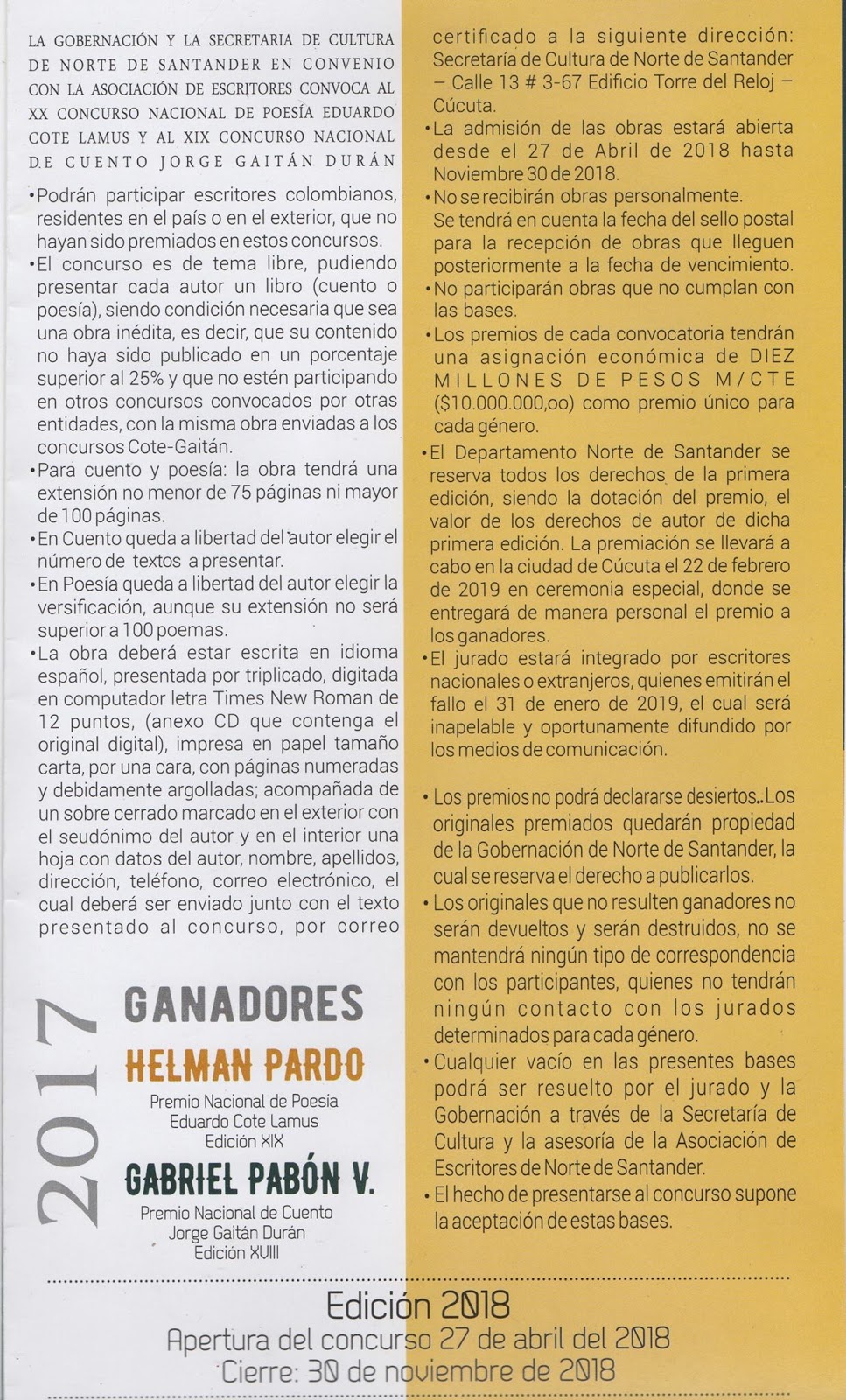 Publicado por: Henry Alexander 06 Nov 2018 | 6589 Visitas Premio Nacional de Poesía y Cuento Eduardo Cote Lamus y Jorge Gaitán Durán Invitados a participar en el Premio Nacional de Poesía y Cuento Eduardo Cote Lamus y Jorge Gaitán Durán, 2018. Acá las bases: